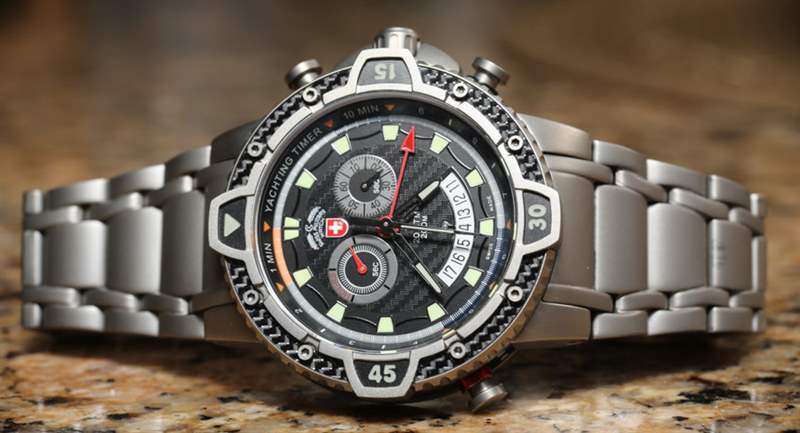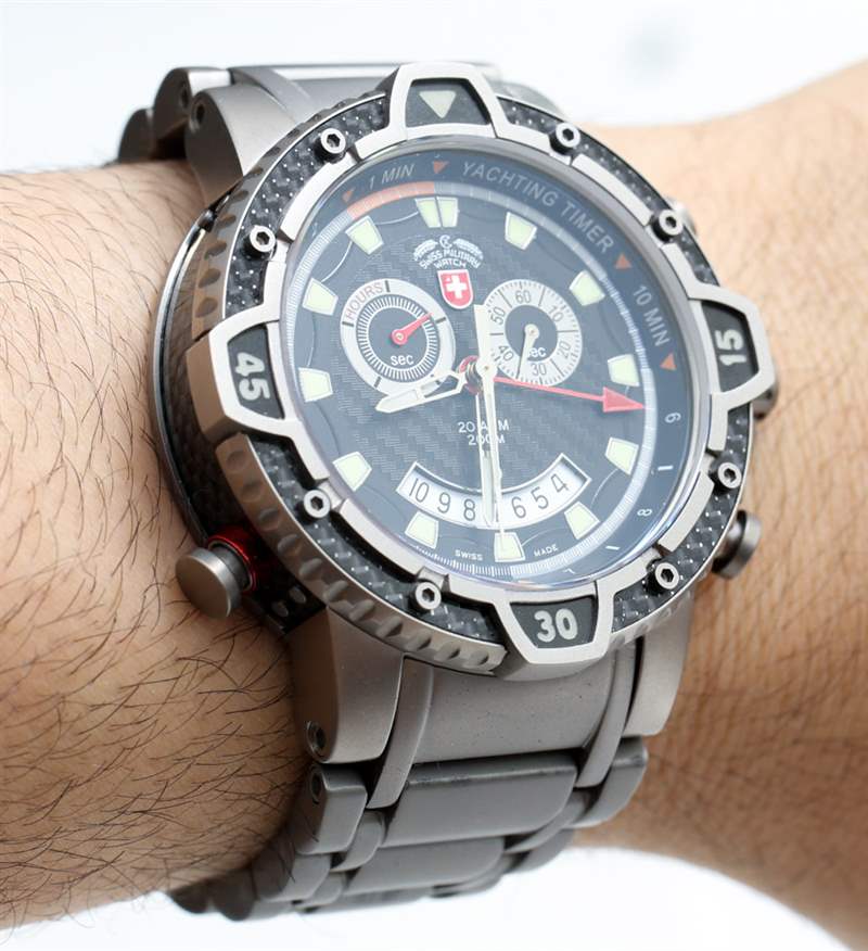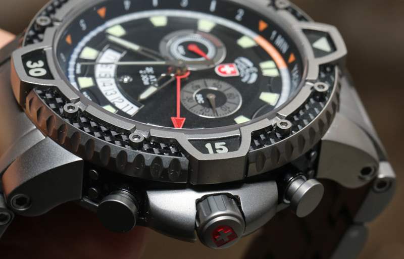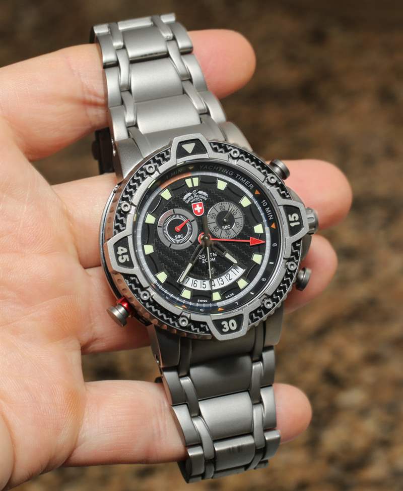 與機(jī)械式 20,000 英尺潛水員不同,臺(tái)風(fēng)是一款石英表。我們的想法是將帆船賽計(jì)時(shí)器、計(jì)時(shí)碼表和鬧鐘整合到一塊手表中,采用耐用且炫酷的設(shè)計(jì)。臺(tái)風(fēng)最好的部分很容易就是表殼和表鏈。Swiss Military Watch 在表殼設(shè)計(jì)和構(gòu)造上真的全力以赴。45 毫米寬的外殼在細(xì)節(jié)方面是我以前從未見過的。表殼由鈦和碳纖維元素制成。表盤周圍有一個(gè)大的旋轉(zhuǎn)表圈和三個(gè)按鈕以及一個(gè)旋入式表冠。表殼上的所有細(xì)節(jié)都很有趣,從許多鈦螺絲到表殼側(cè)面包裹的碳纖維。
